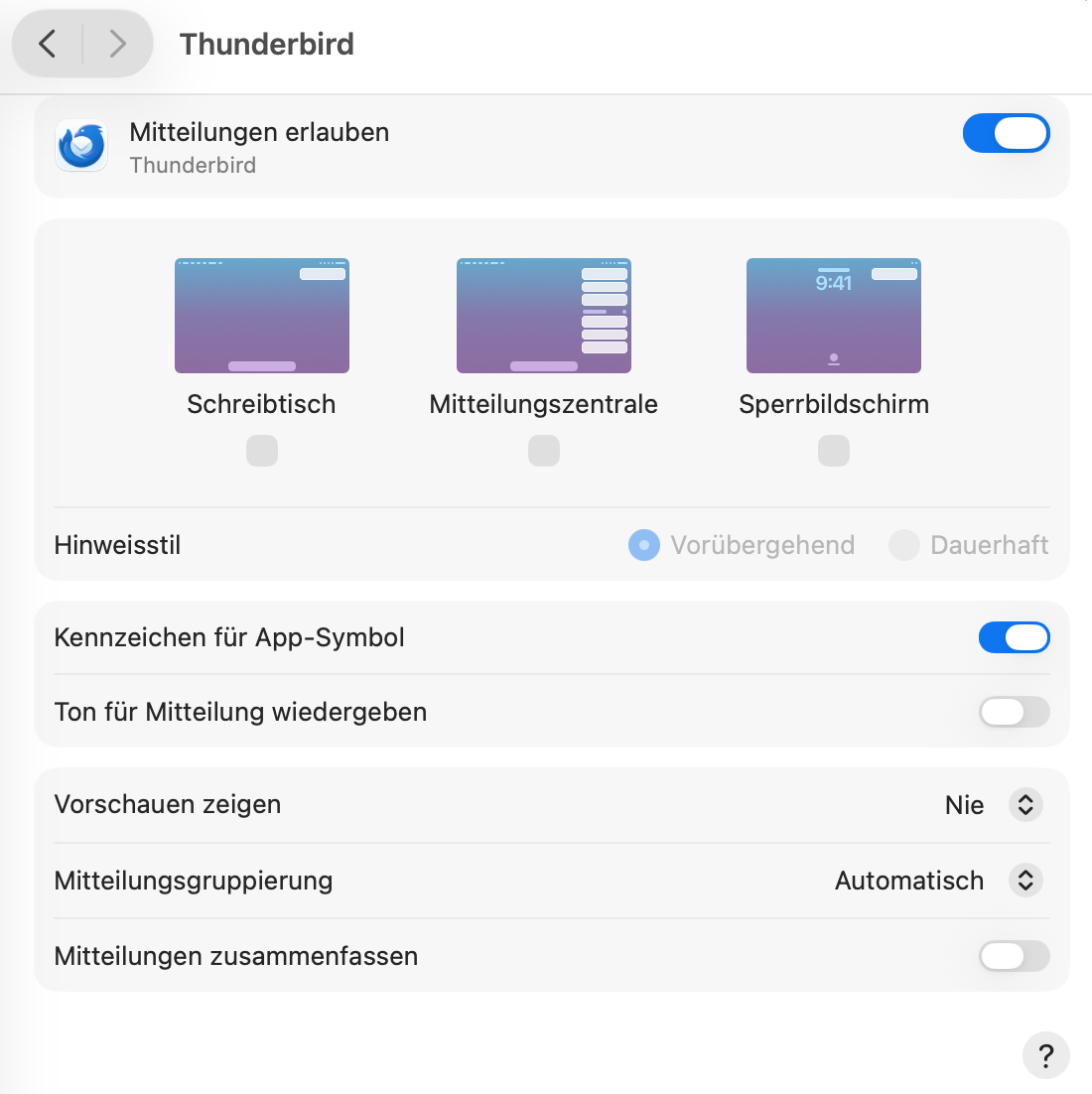 Bei jeder neu eingetroffenen Nachricht einen Ton zu hören oder ein aufpoppendes Fenster zu sehen, erzeugt eine kognitive Last und kann als aufdringlich und störend empfunden werden. Insbesondere Töne können gehört werden, auch wenn der Nutzer gerade nicht vor dem Computer sitzt und Stress auslösen. Er weiß dann vielleicht nicht, wo genau der Ton herkommt. Eine stille, unaufdringliche Benachrichtigung in Form einer kleien Zahl neben dem Symbol zum Öffnen von Thunderbird genügt völlig. Die Konfiguration von Mitteilungen unterscheidet sich je nach Plattform. Hier ist nur der Weg für die Plattform macOS zu sehen.