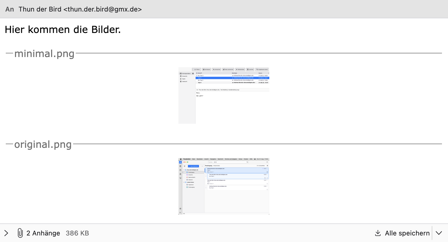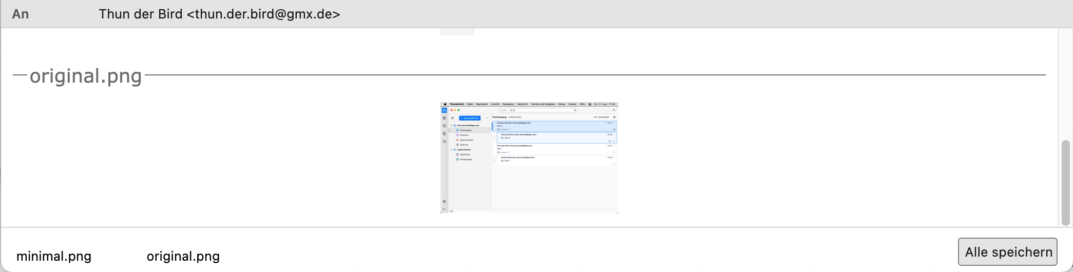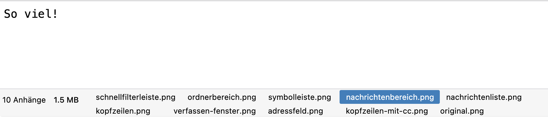 Die originale Anhangleiste hat eine extra Zeile mit einer Schaltfläche zum Auf- und Zuklappen des Anhangbereiches. Rechts neben dem Namen der Dateinamen steht eine Größenangabe. Links neben dem Namen ein Symbol für den Dateityp. Die Gesamtgröße aller Anhänge ist auffällig hervorgehoben. All das habe ich entfernt.