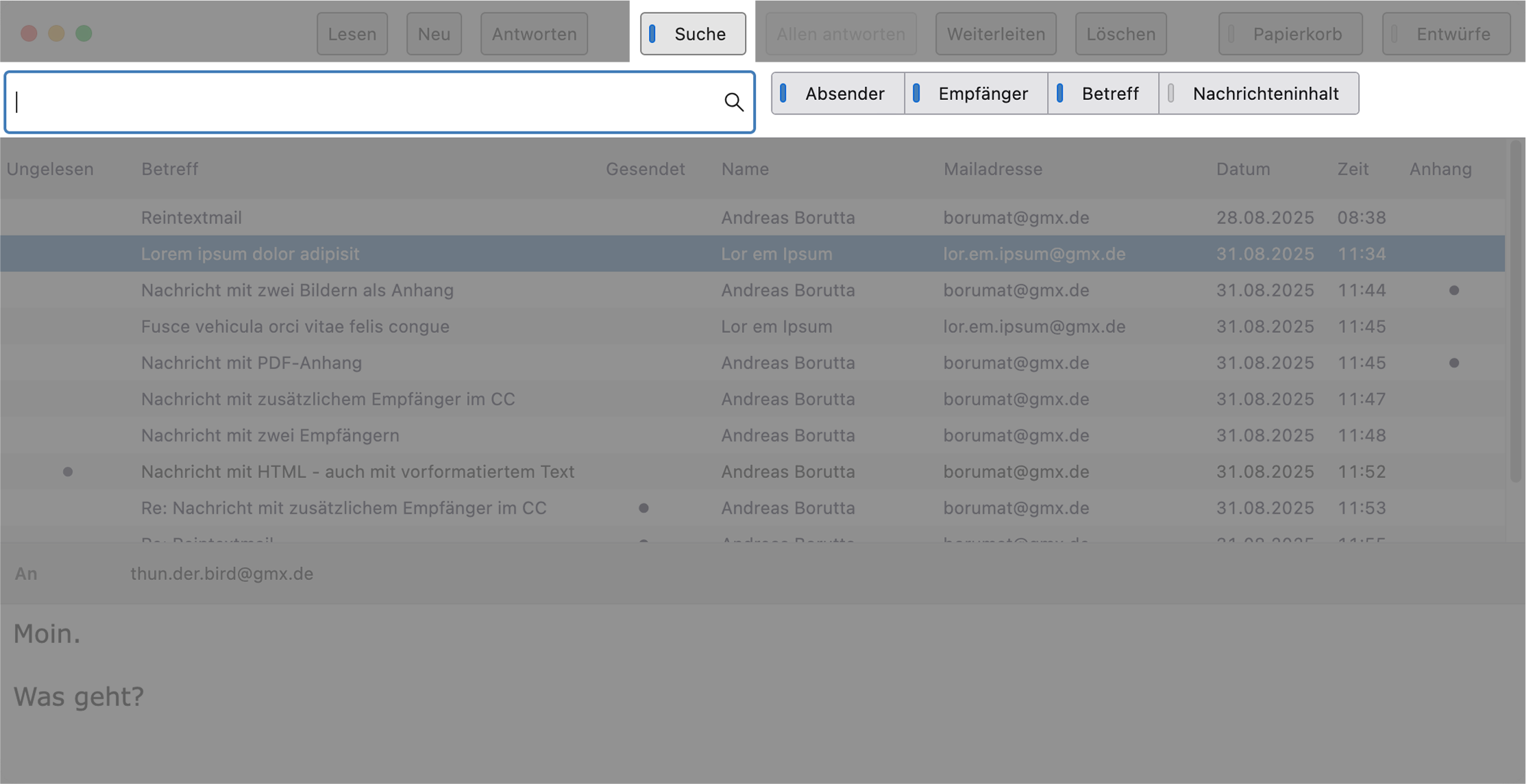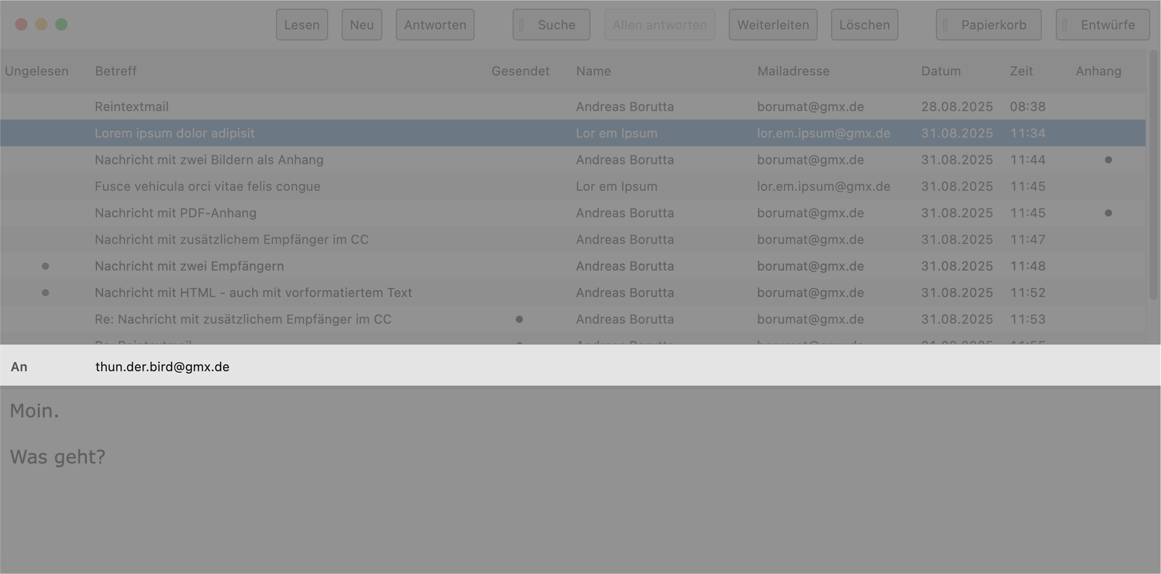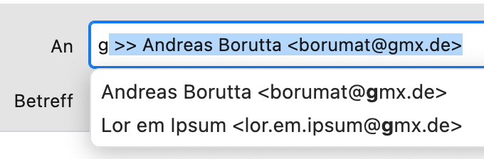 Die Grundidee ist: Mailadressen nie manuell ins Adressbuch eintragen. Weil Empfänger, die man erstmals in einem Verfassenfenster einträgt, automatisch im Adressbuch landen. Dito für Absender von empfangenen Nachrichten. Es genügt die Eingabe weniger Zeichen im Adressfeld und es werden sofort Übereinstimmungen vorgeschlagen.